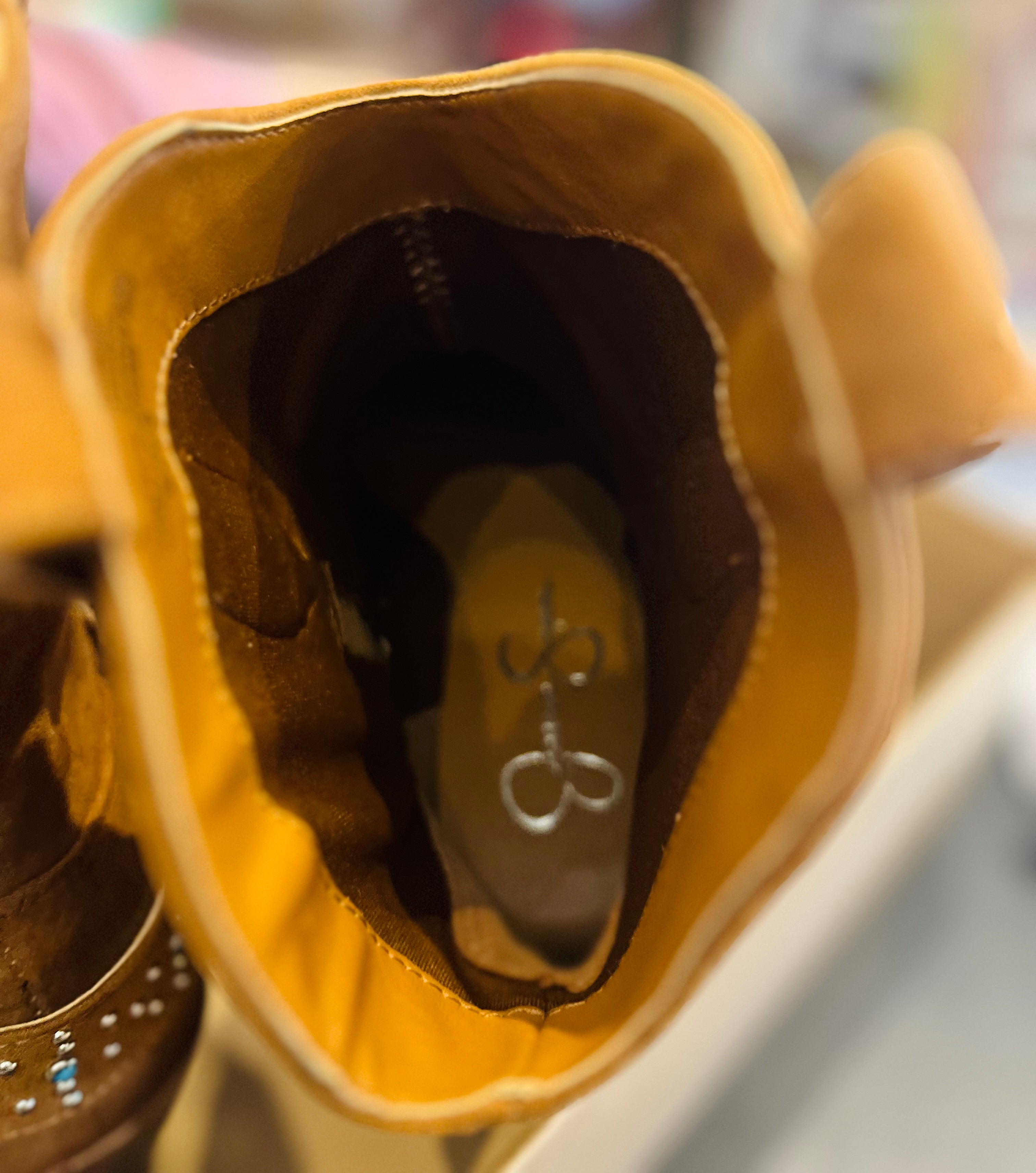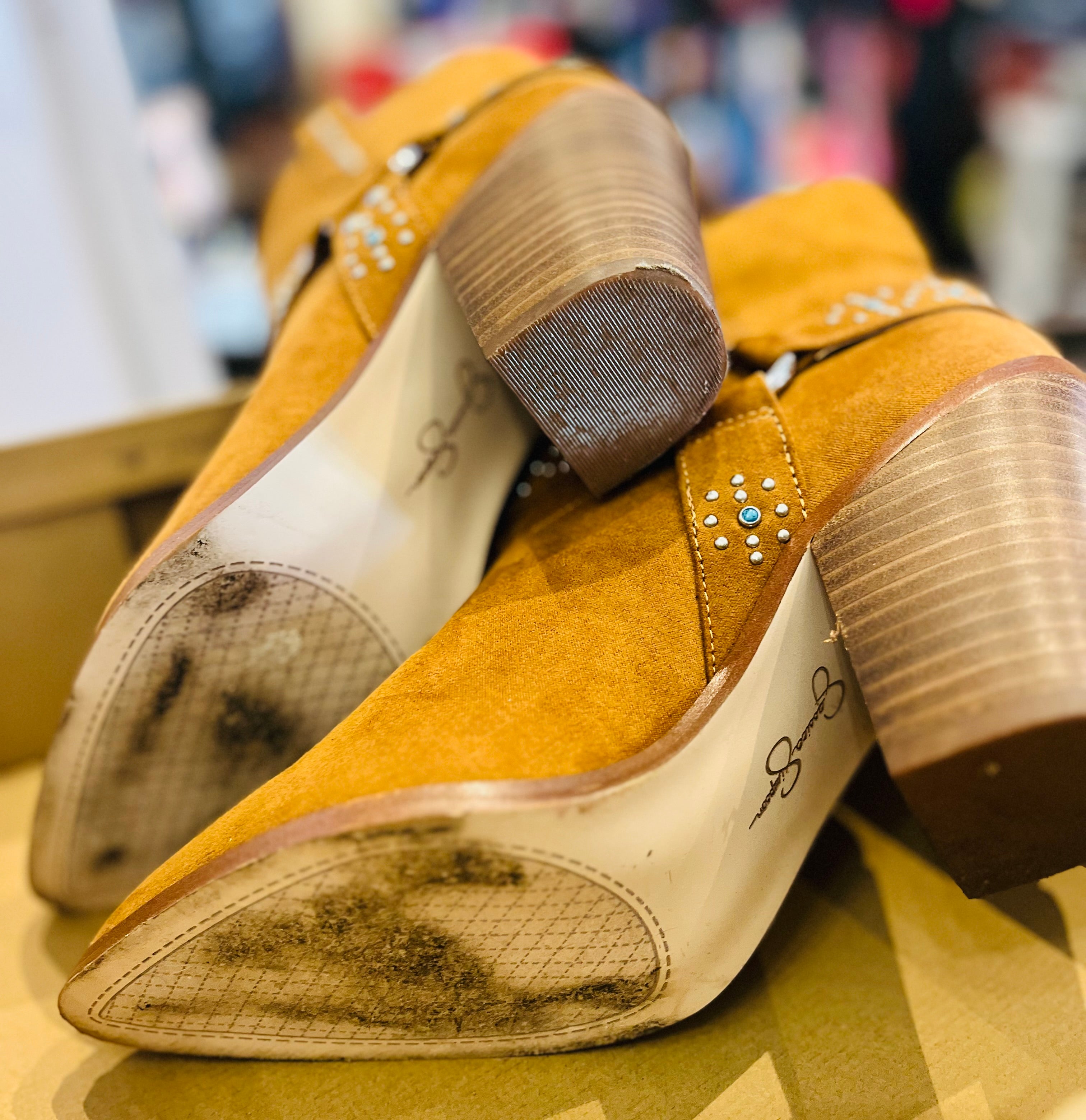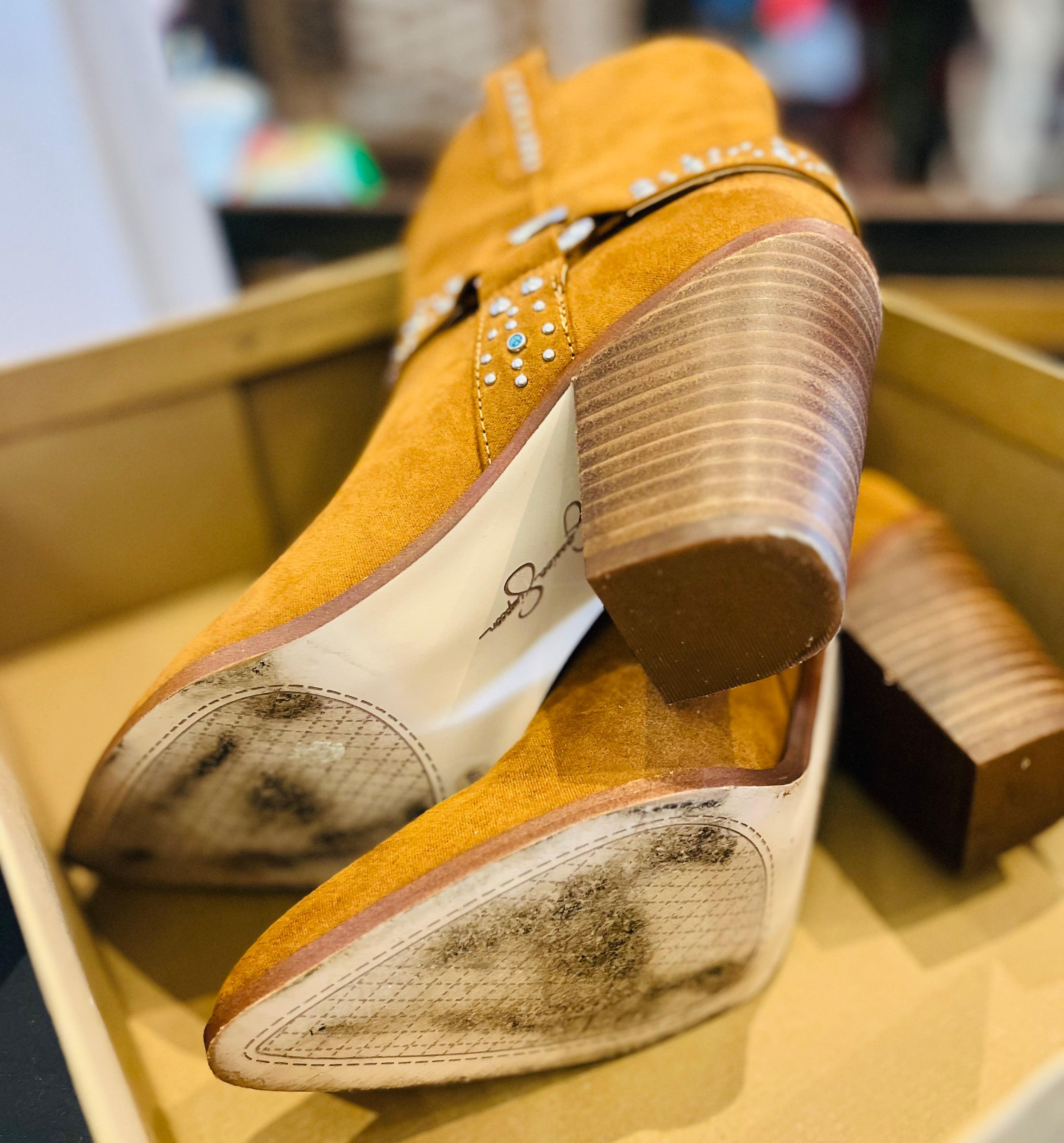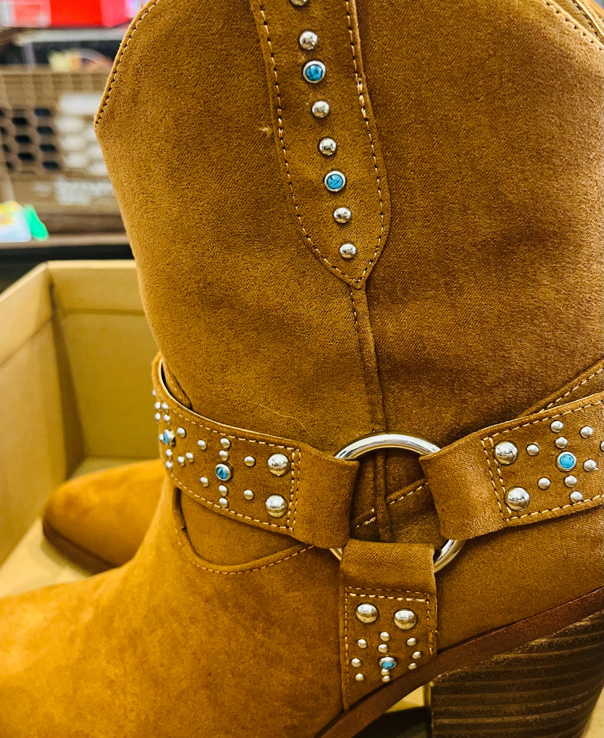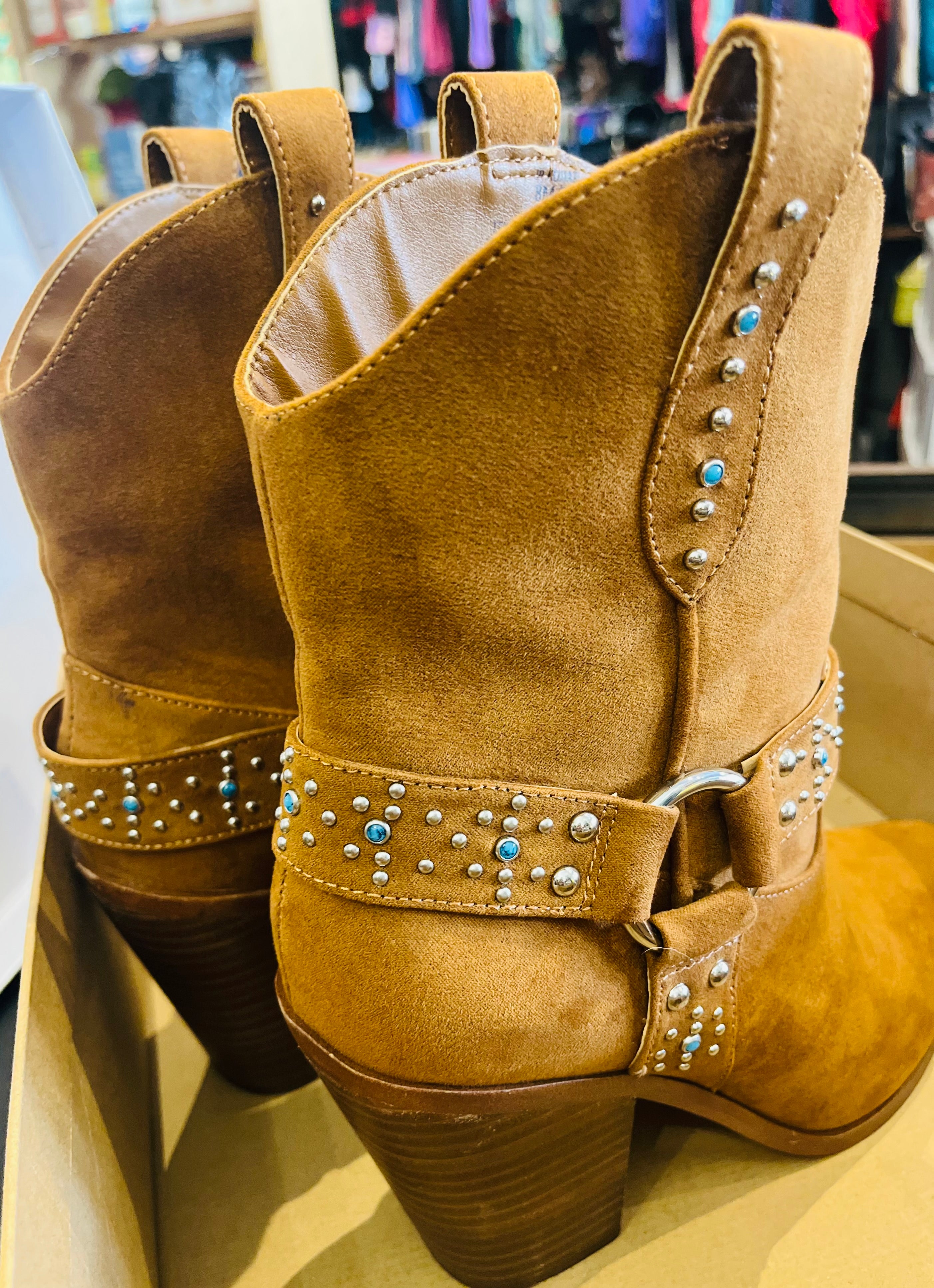 Jessica Simpson Koxia 2 Turquoise Stud Tan Western Pointed Toe Block Heel Boots sz 8M w Original Box