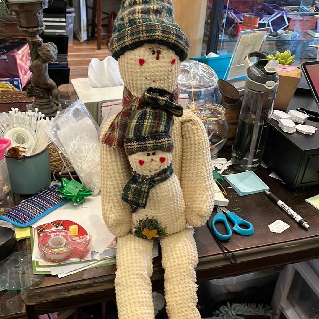 Antique Stuffed Decorative Snowman and Baby w Bell USED