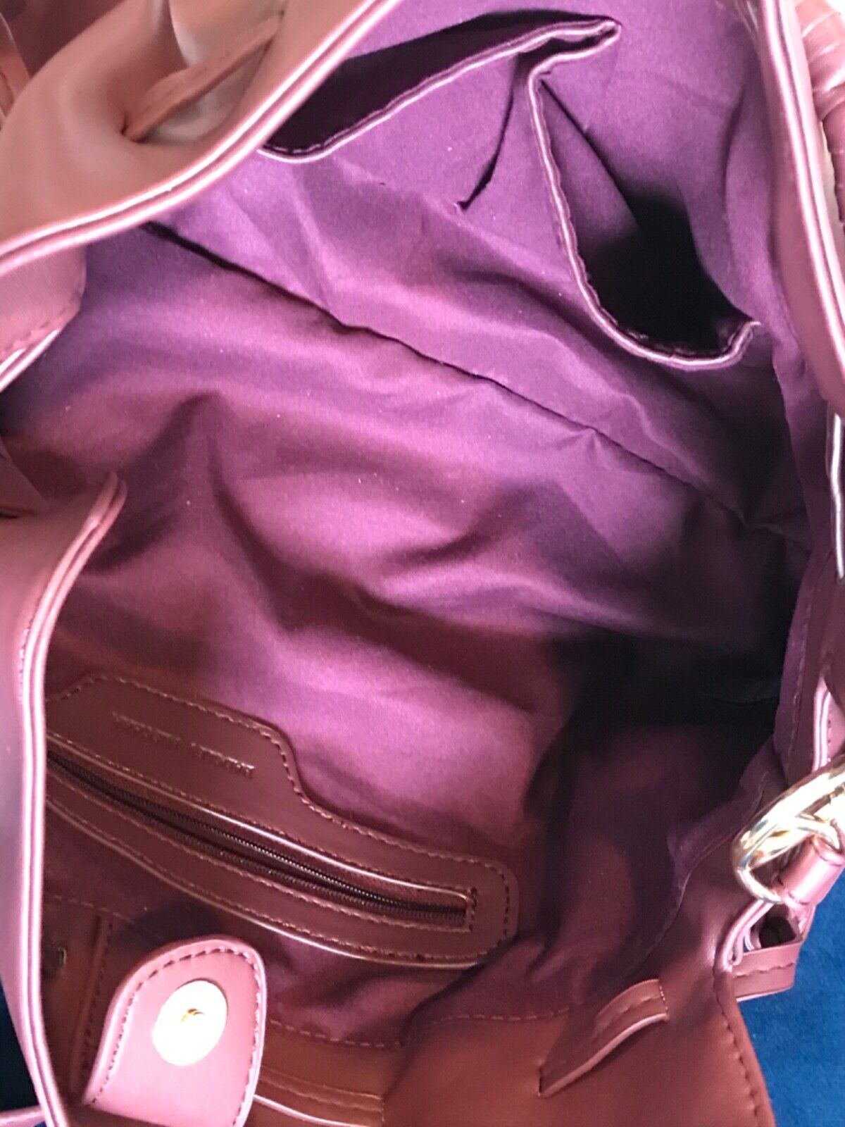 Badgley Mischka Mono Colored Faux Leather Drawstring Bucket Crossbody Bag Wine GUC!You need a handbag as chic as you are and that's roomy enough to hold all of your essentials. This bucket bag is just what you've been looking for and it has a detachable strap and a handle to convert it from a crossbody to a satchel in a snap. From Badgley Mischka.