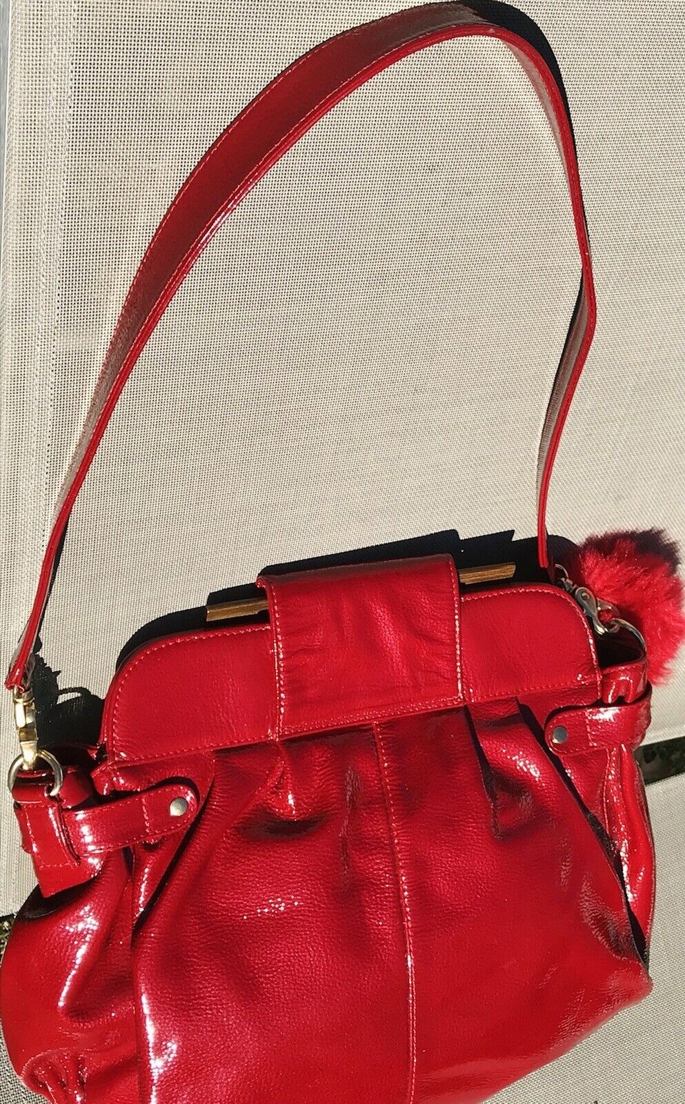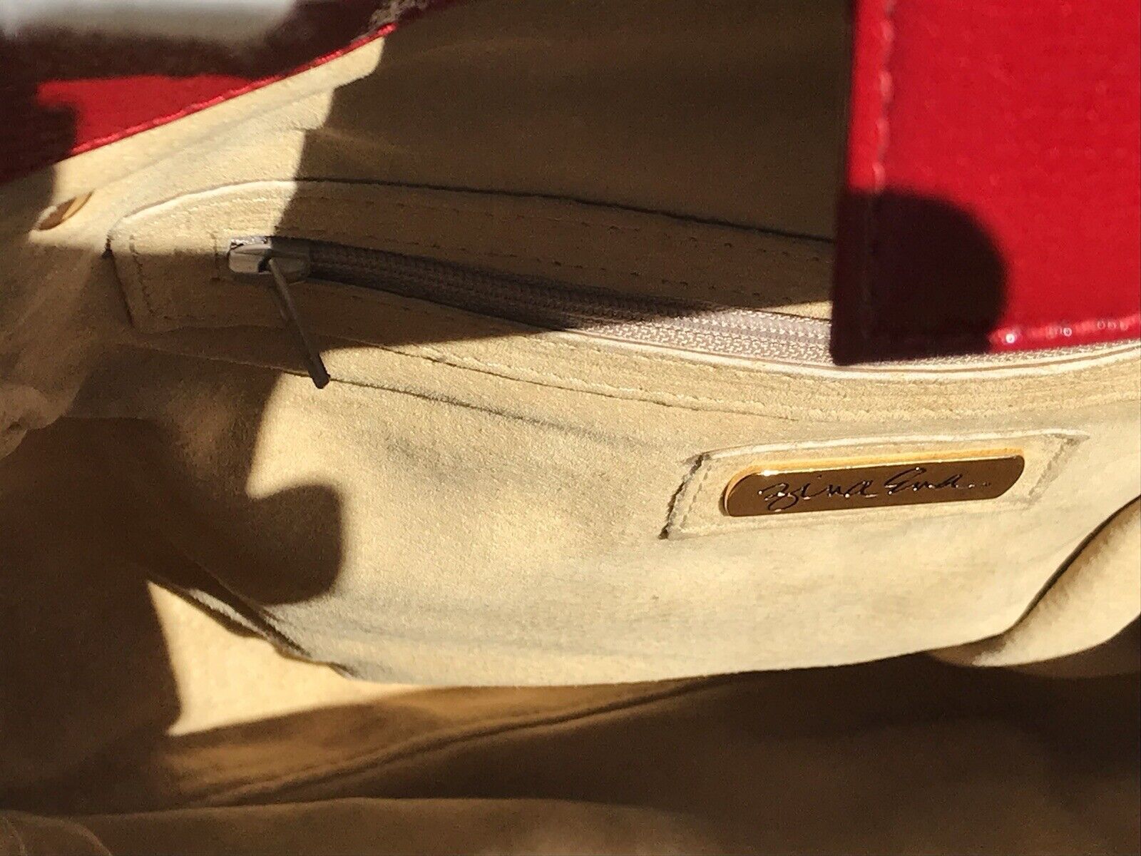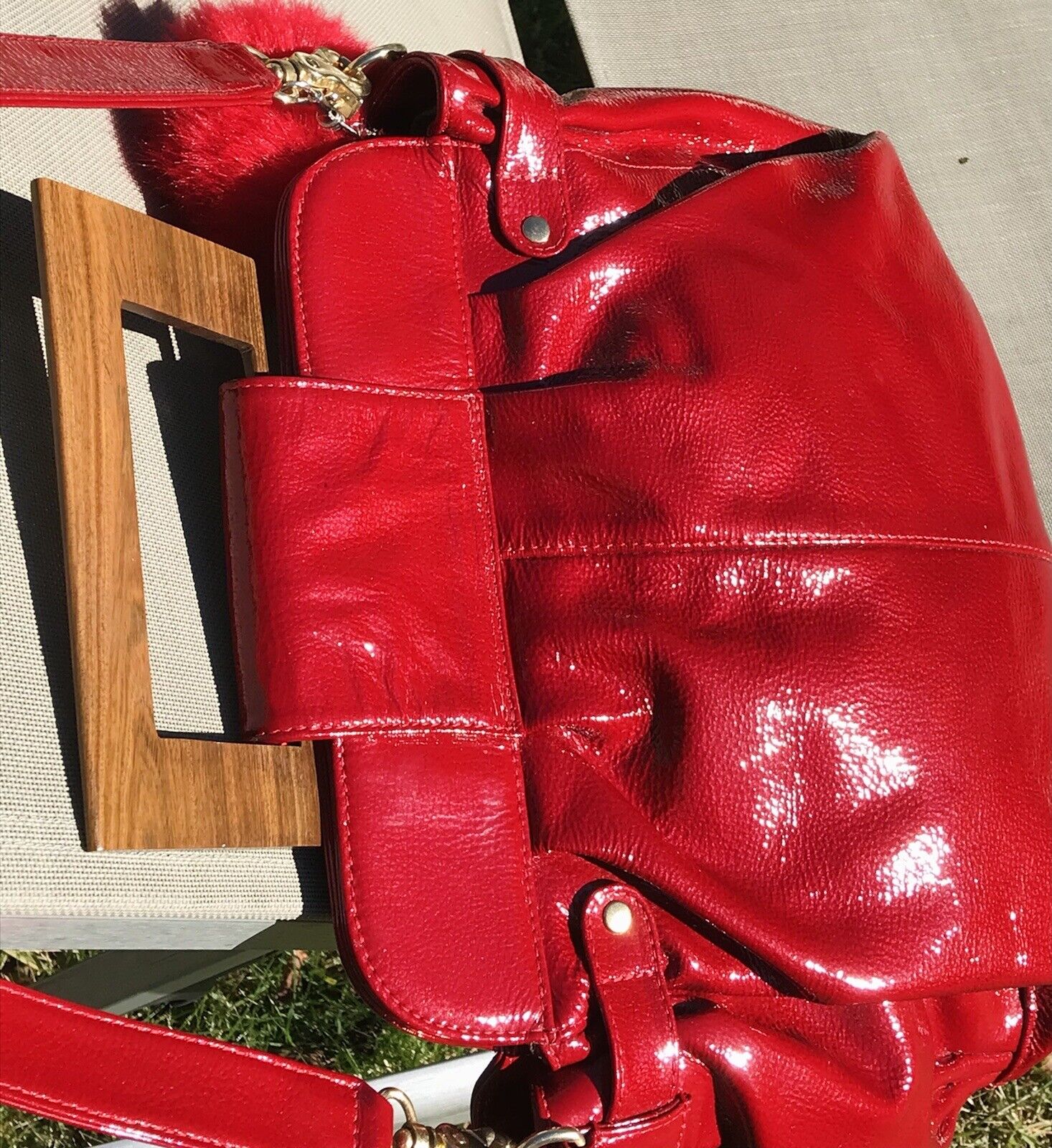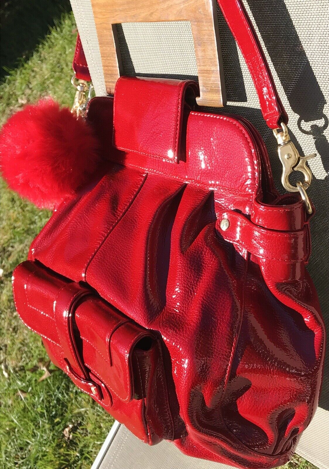 GREAT bag! Bright and clean with NO scratches, peeling, rips or tears at all! One minor (faint) smudge on inside lining but barely noticeable. No manipulation to this bag! Zippers, magnetic clasps all fully functional and close properly. Wood Handle in beautiful condition and adjustable strap same apple red with gold hardware. Large bag with five pockets total (4 inside one with flap outside). Send a message with any questions! Feel free to make a competitive offer and please only make a bid or offer if you are willing to pay! Thank you for stopping by!
