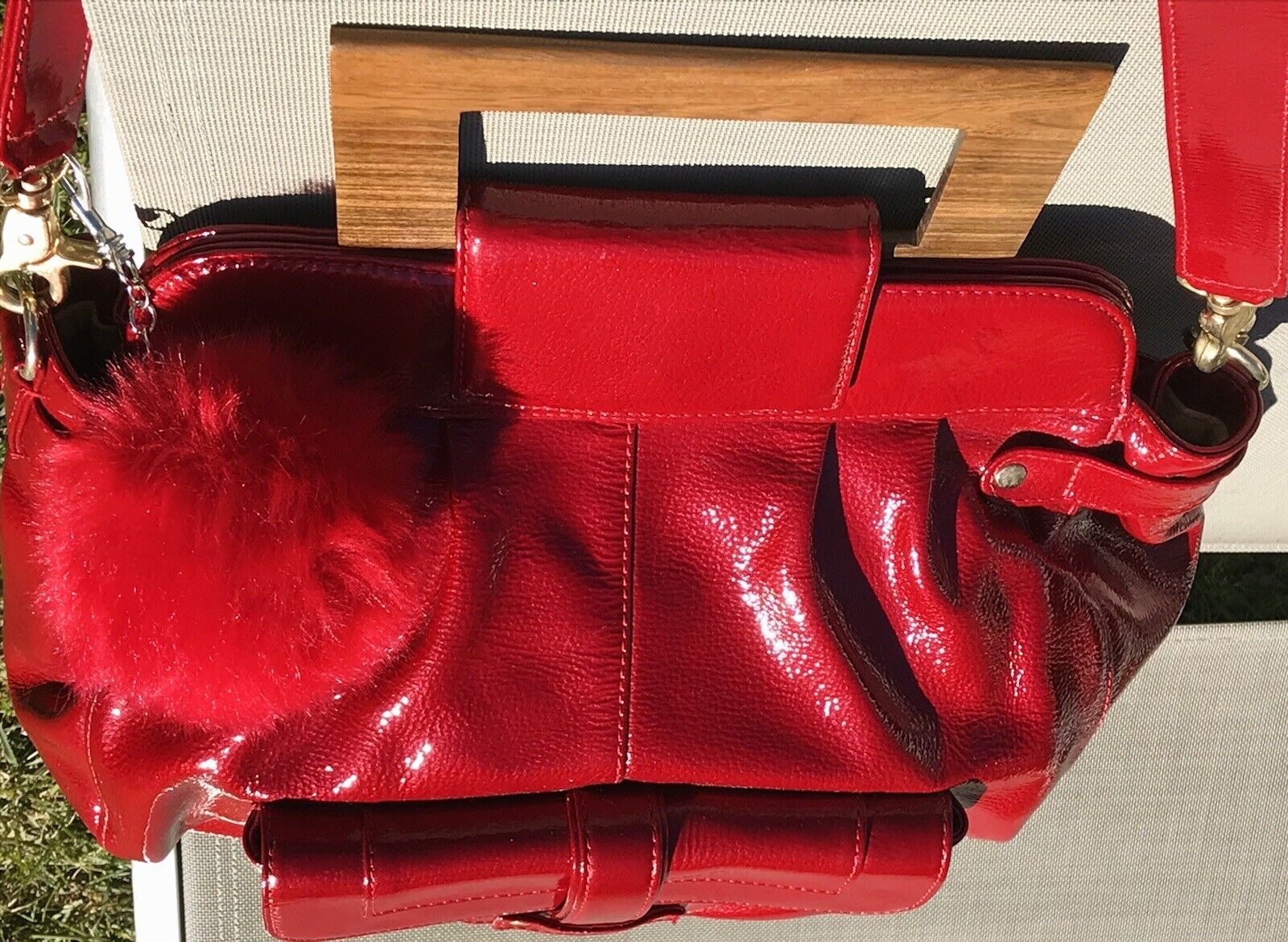 ZINA & EVA Apple Red Patent 5 Pocket Leather Bag Over Shoulder/Wood Handle EUC!.